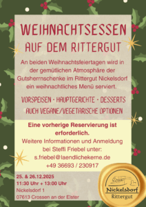 An beiden Weihnachtsfeiertagen wird in der gemütlichen Atmosphäre der Gutsherrnschenke im Rittergut Nickelsdorf ein weihnachtliches Menü serviert. Ausgewählt werden kann zwischen Vorspeisen, Hauptspeisen und Desserts, auch vegetarische und vegane Optionen sind möglich.