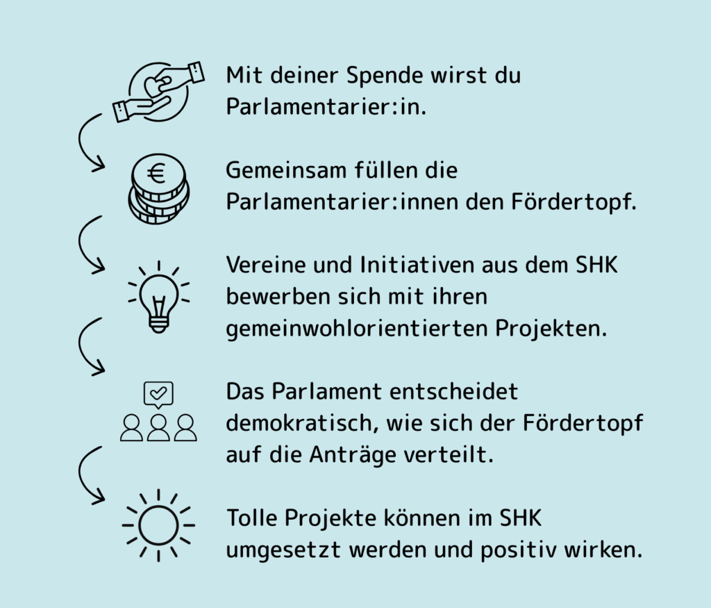 Bei einem Spendenparlament können Einzelpersonen, Unternehmen oder Organisationen aus der Region einen Betrag (ab 50€) spenden, um damit einen gemeinsamen Spendentopf zu füllen. Mit dieser Spende wird man Parlamentarier:in und erhält, unabhängig von der Spendenhöhe, genau 1 Stimme im Parlament.