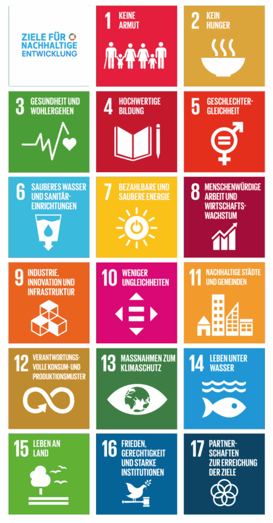 Eure Arbeit im Allgemeinen oder eure konkreten Projektziele zahlen auf mindestens eins der 17 abgebildeten UN-Nachhaltigkeitsziele (Sustainable Development Goals (SDG)) ein (Hier mehr erfahren), oder/und fördern die Zivilgesellschaft oder/und die Demokratie.